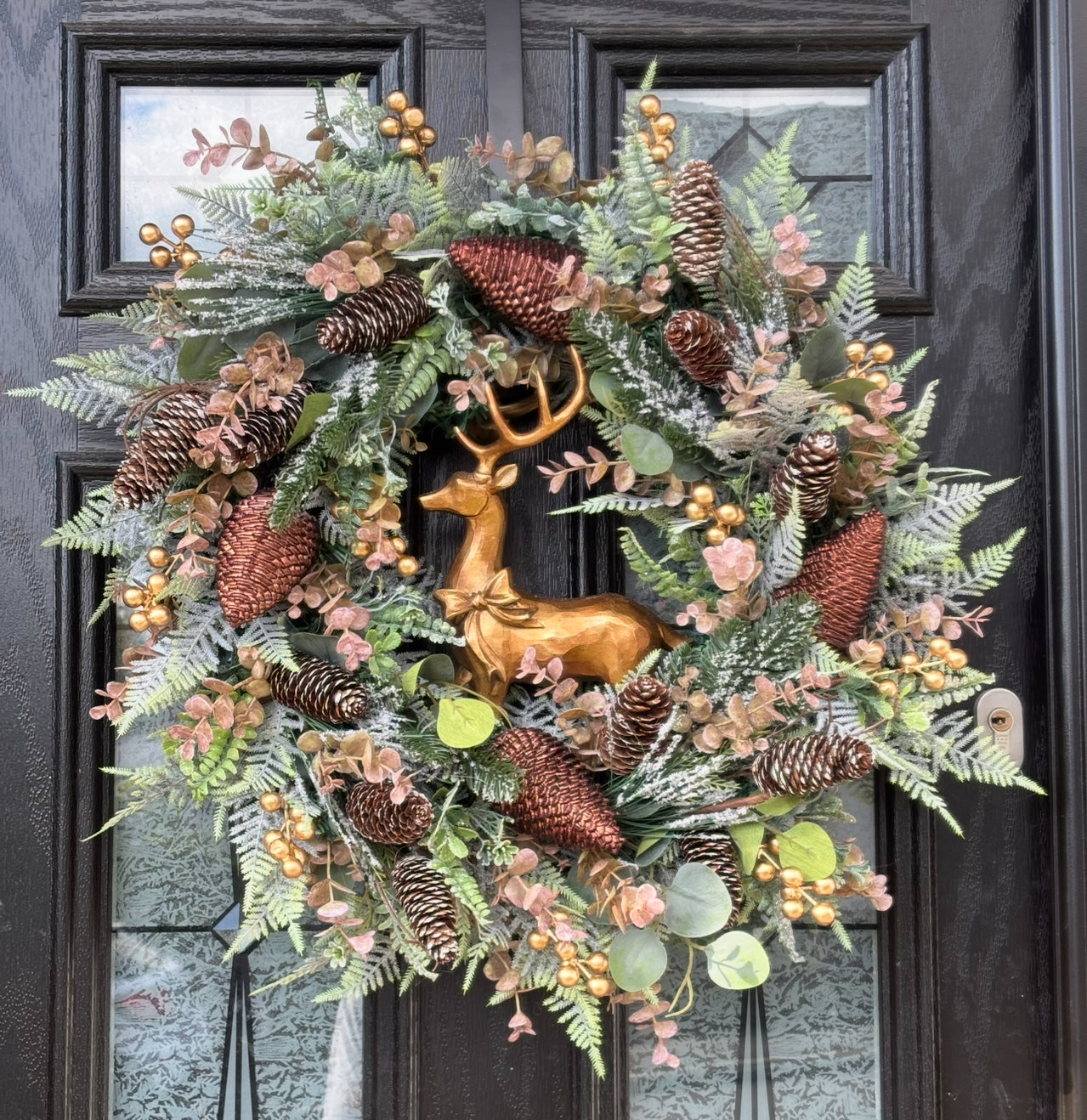 - Mixture of frosted foliage ,Gold berries Brushed Gold Wooden Stag & pinecones